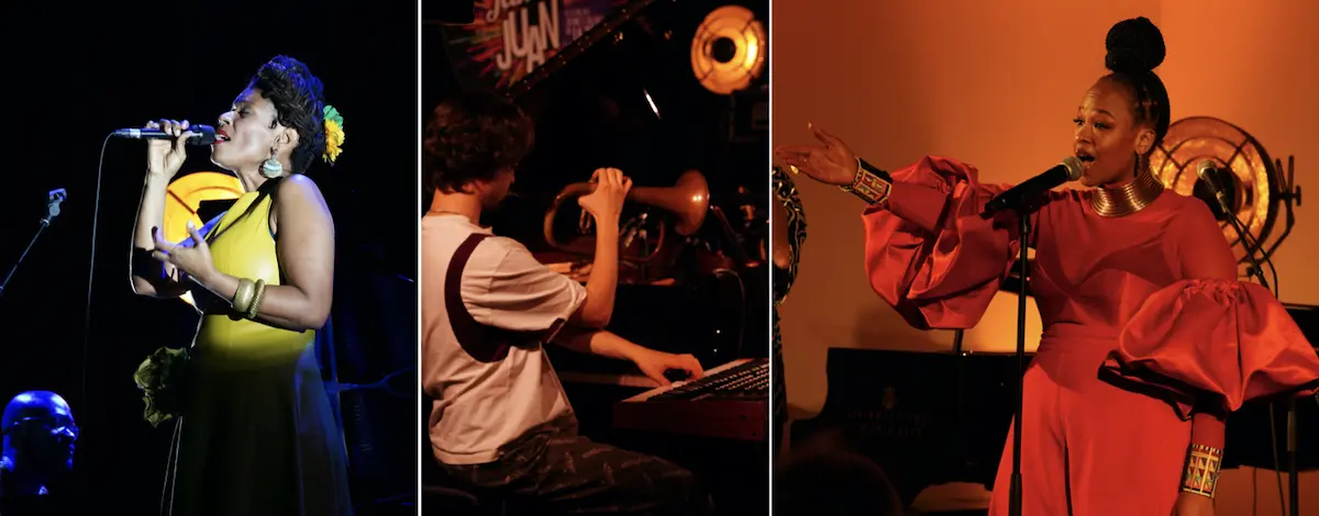 Traditionally, each evening in the amphitheatre, the largest hall of the Palais des Congrès, features established artists performing full-length concerts. For her first appearance in Juan-les-Pins, Cape Verde’s Carmen Souza enchanted the crowd with her unclassifiable melodies. Teaming up with longtime collaborator and bassist Theo Pascal, she brought along Elias Kacomanolis on drums and Jonathan Idiagbonya on piano.