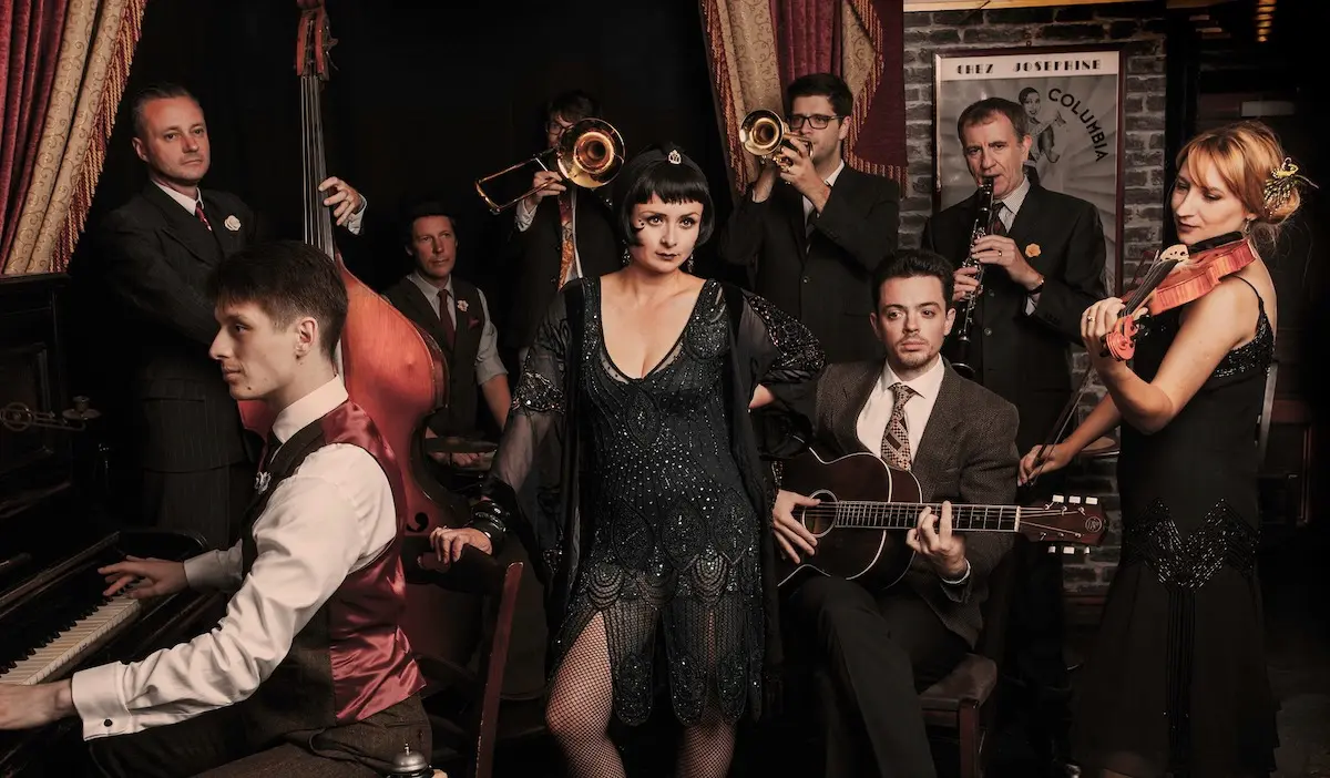 House of the Black Gardenia is a nonet that delivers hot vintage swing with a contemporary edge. Its founder members, double bassist Neil Hopper and vocalist Elise Rana Hopper, used to run popular swing-dance nights in Newcastle. They became so immersed in 1920s & 30s music that in 2014 the pair decided to form their own band. Initially they thought it might be something like Tuba Skinny but things didn’t turn out that way. Neil says it was difficult finding the right musicians so they “mainly just nicked people out of the Strictly Smokin’ Big Band and others in the North East”. The selection might sound a bit haphazard but don’t be misled, these talented artists more than fit the bill.